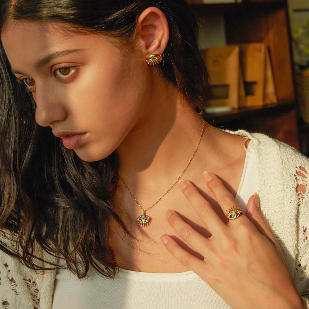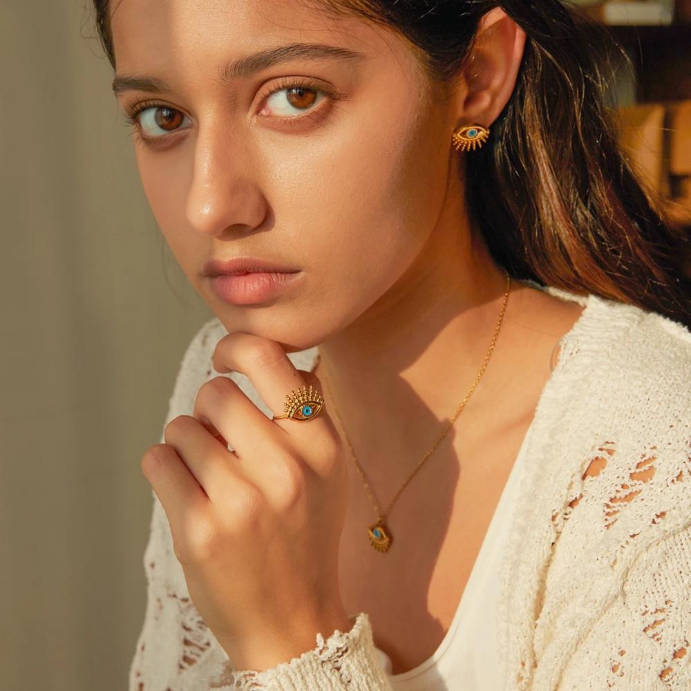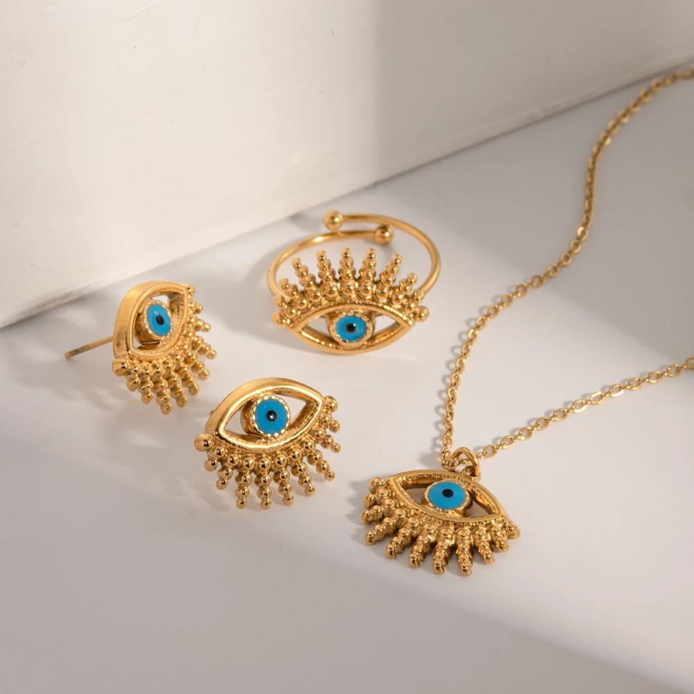 استمتعي بلمسة من الأناقة والجمال مع هذا الطقم المميز. يتميز بتصميم عيون جميلة تتوسطها حبة زرقاء ساحرة. العيون تعكس الروحانية والجاذبية، في حين تُضفي الحبة الزرقاء لمسة من اللون والتألق. يمكن ارتداؤه في المناسبات الخاصة أو كإضافة رائعة لمجموعة مجوهراتك