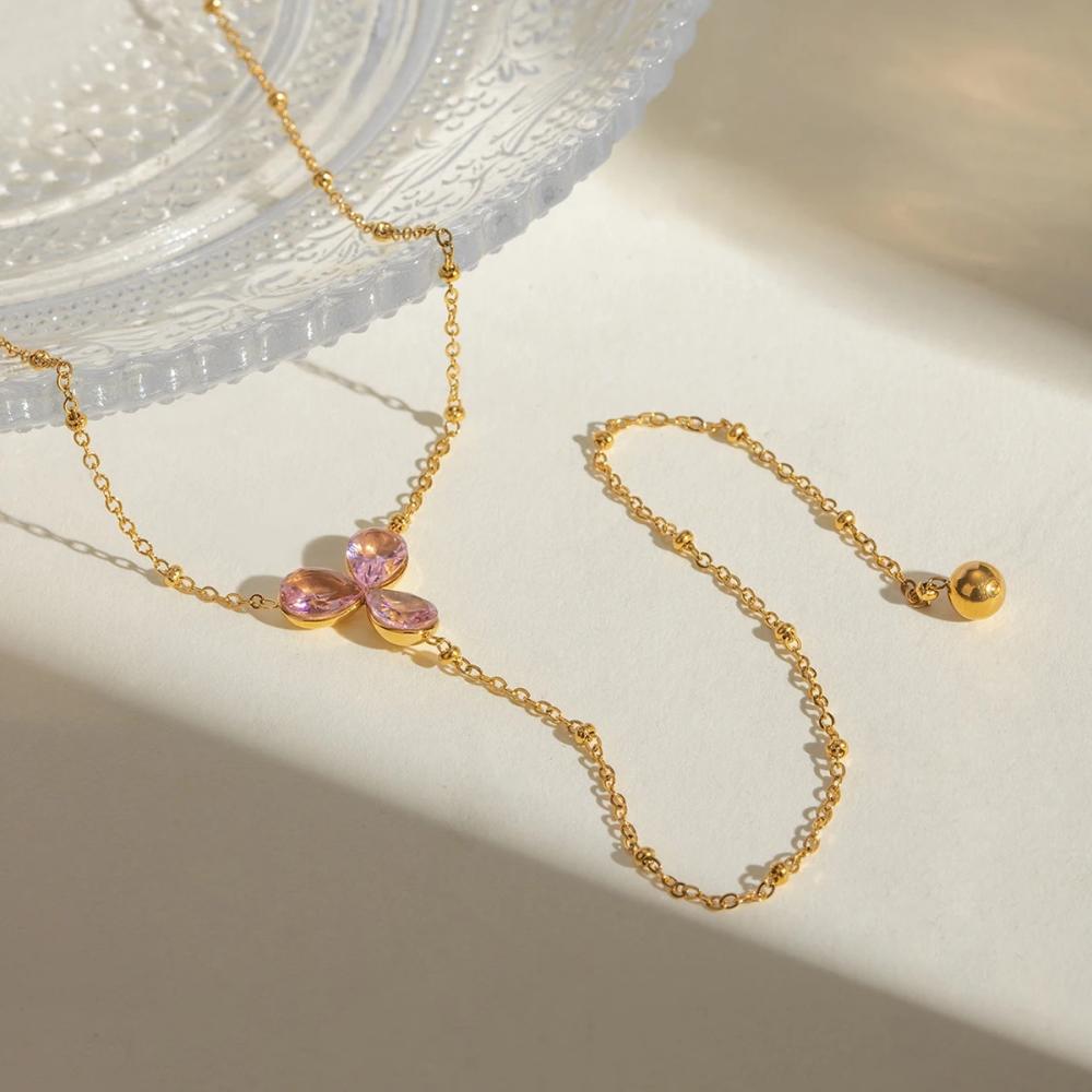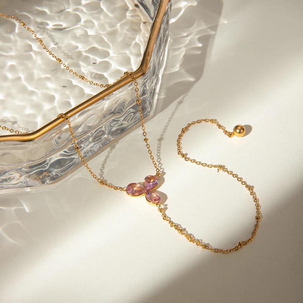 تألقي بجمال لا يُضاهى مع قلادة “قطرات الجمال الوردي” المطلية بالذهب عيار 18. هذه القطعة الرائعة تجمع بين الأناقة والبساطة، حيث تتدلى ثلاث جواهر وردية ...