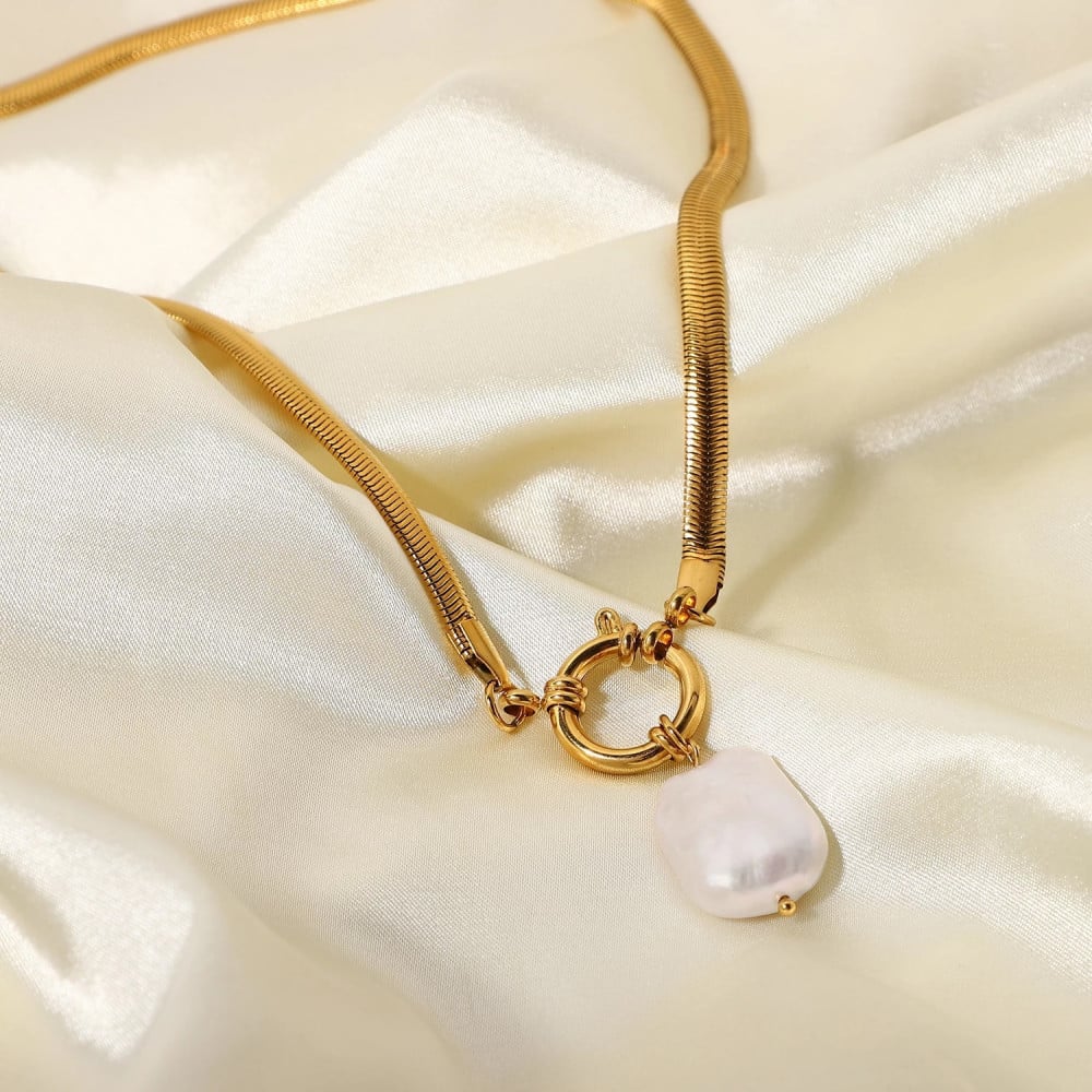 امنحي اطلالتك الساحرة مزيد من التألق مع هذه السلسلة من مجموعة قايا المميزة وانعمي بهالة من حضورك الخلاب. سلسلة مستواحة من جلد الثعبان الفريدة وتتنصفها حبة لؤلؤة مذهلة لتناسبك